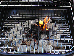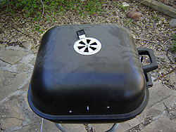First, the charcoal. Yes the grill, as all true grills must be, is a charcoal grill. None of that deviltry that is the… gas grill. I prefer Kingsford or possibly the charcoal at Wild Oats (I haven’t tried it yet). This particular bag comes with mesquite briquettes.